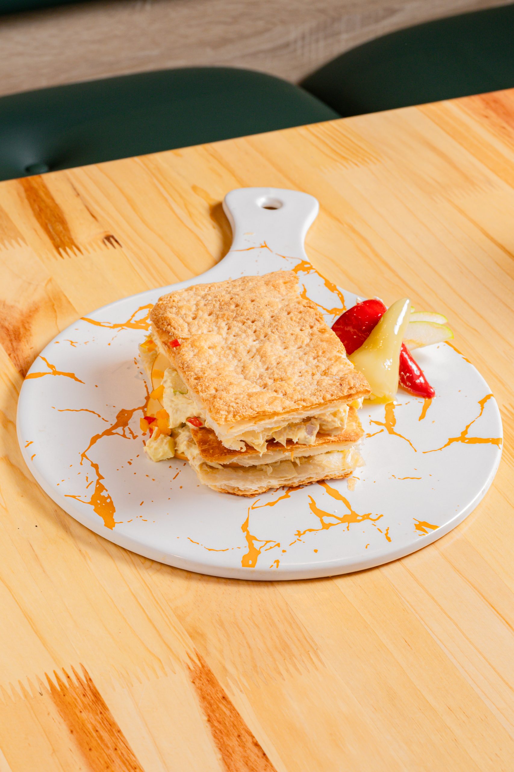 Milhojas especial de la casa, ensalada de atún en salsa mataqui con manzana verde, acompañado de una mini ensalada de la huerta.