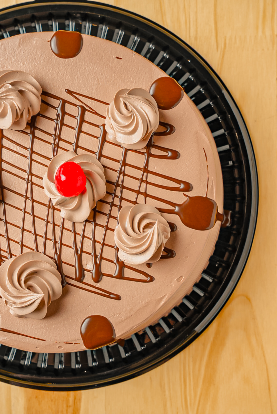 Masa tipo brawnie, rellena de arequipe, cubierta en crema de chocolate.