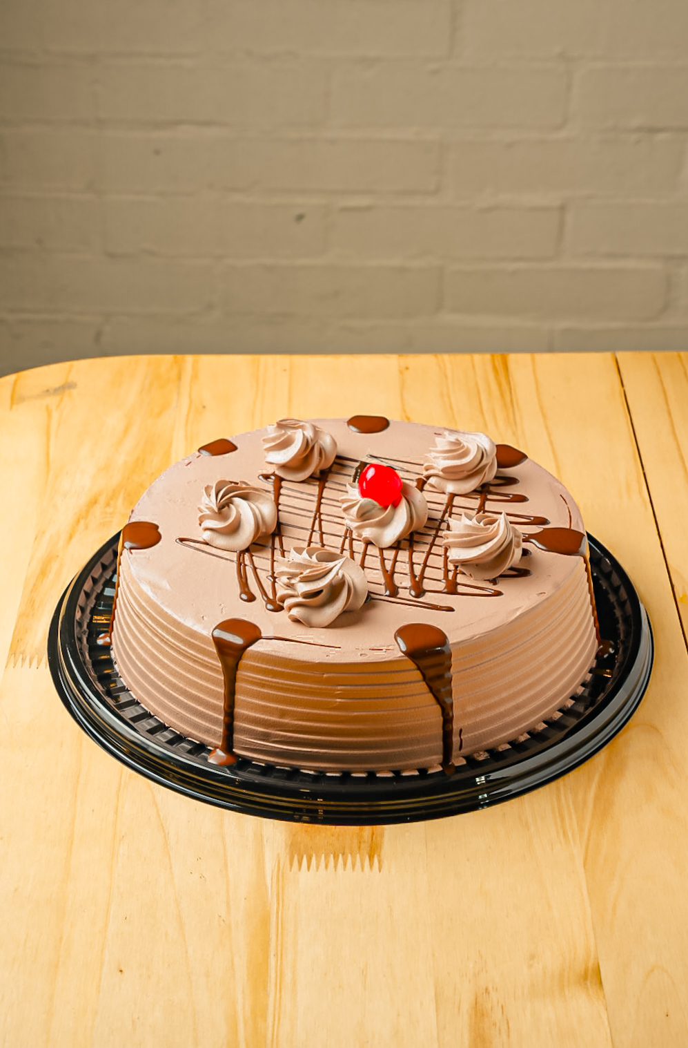 Masa tipo brawnie, rellena de arequipe cubierta de crema de chocolate.